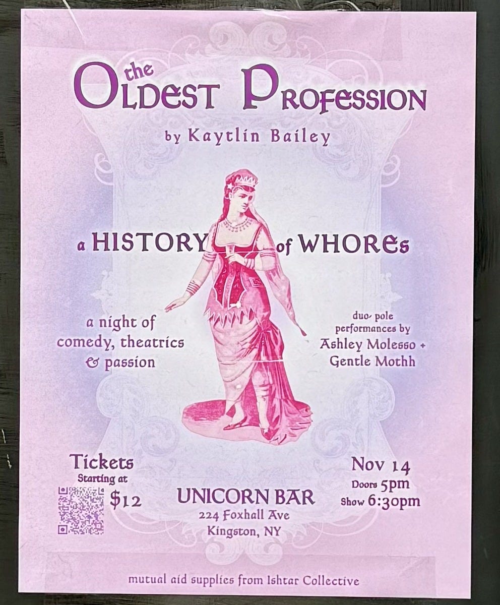 Show in Upstate NY: Nov 14 at Unicorn Bar Kingston | The Oldest Profession : A History of Whores| Doors 5 pm | Show 6:30pm | Dual pole performance by Ashley Molesso + Gentle Mothh | 1 hour Performance - comedic history of Whore’s written and performed by Kaytlin Bailey | Ishtar Collective Mutual Aid Table | Early Bird Tickets $12 - $22 | $30 at the door
